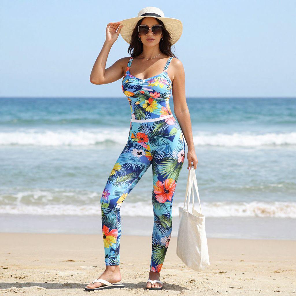 Photograph of a woman in colorful floral leggings and tank top, wearing a sun hat and sunglasses, holding a shopping bag on a sunny beach with waves
