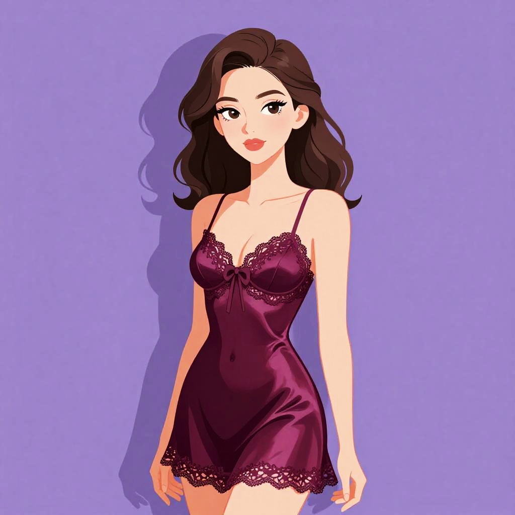 Illustration of a woman with a pretty face and long brown hair wearing a vintage-inspired deep burgundy silk chemise. The chemise features intricate lace trim, spaghetti straps, a fitted bodice, a flared hemline, and a delicate bow detail, showcasing a subtle sheen on the fabric.