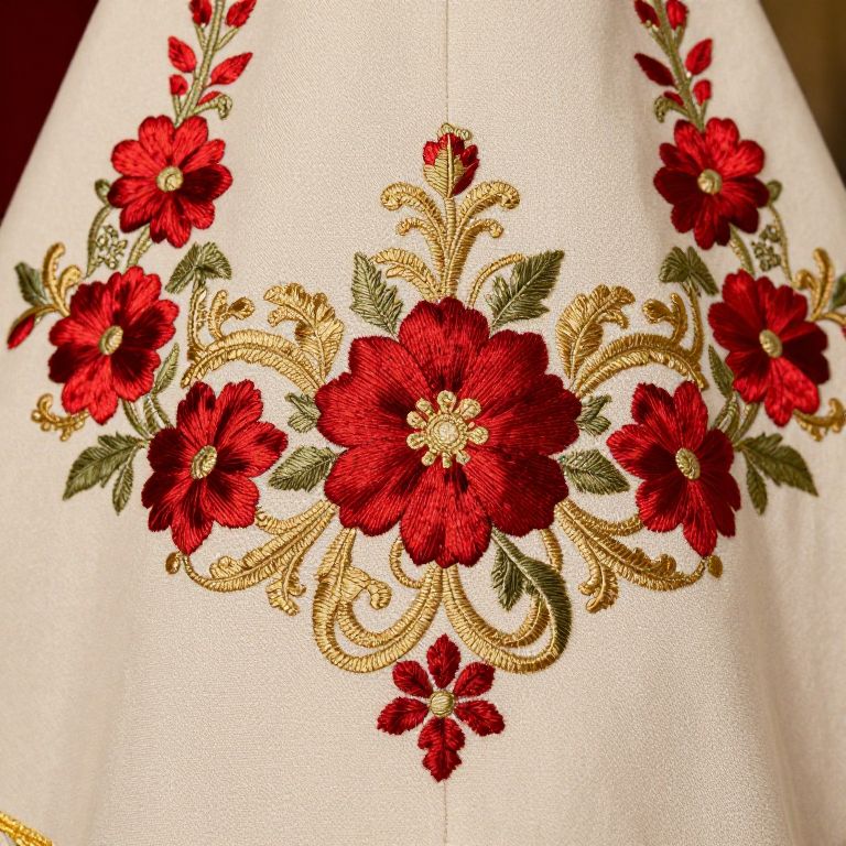 Close-up view of a Holy Week Mantilla featuring intricate vintage embroidery, showcasing vibrant red floral patterns and gold scrollwork against a cream-colored fabric background.