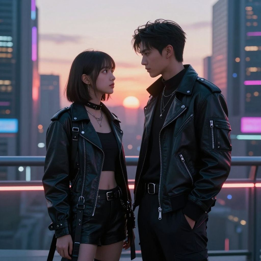 Thailand femboys exploring a bustling Bangkok cityscape at night, illuminated skyscrapers and street signs, fashionable urban clothing, confident and stylish expressions, neon reflections on wet pavement