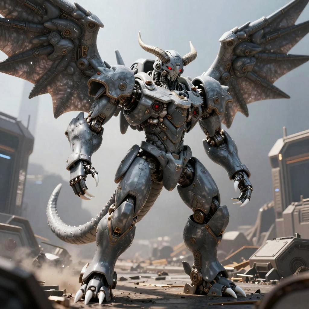Anthro slate-gray minotaur mech, ((lineart)), membranous wings, horns, tail, red eyes, white claws, muscular solo, standing, fighting stance, huge mecha presence, no humans, science fiction, high-tech warzone battlefield, dramatic low side angle, pwide shot, harsh spotlight, 8k wallpaper, RAW photo, best quality, masterpiece, realistic, photo-realistic, mecha (mjstyle), (robot:1.5), (porcelain materials:1.6), (polished metal:1.4)