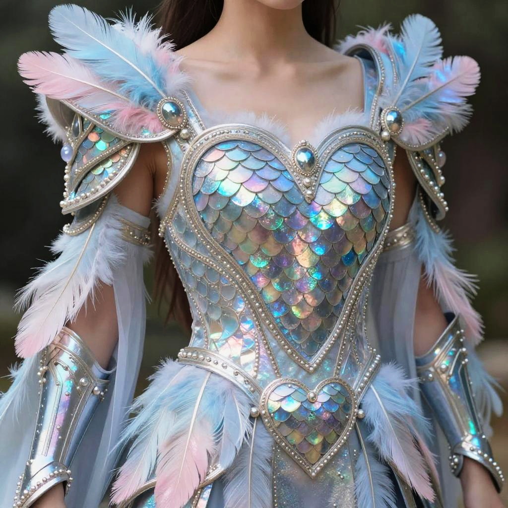 Feather and heart scale themed armor worn by a mythical warrior, combining softness and strength, iridescent colors shifting from blue to pink, intricate craftsmanship with feather layering and heart-shaped scale plating, detailed fantasy concept art
