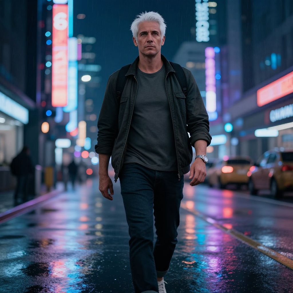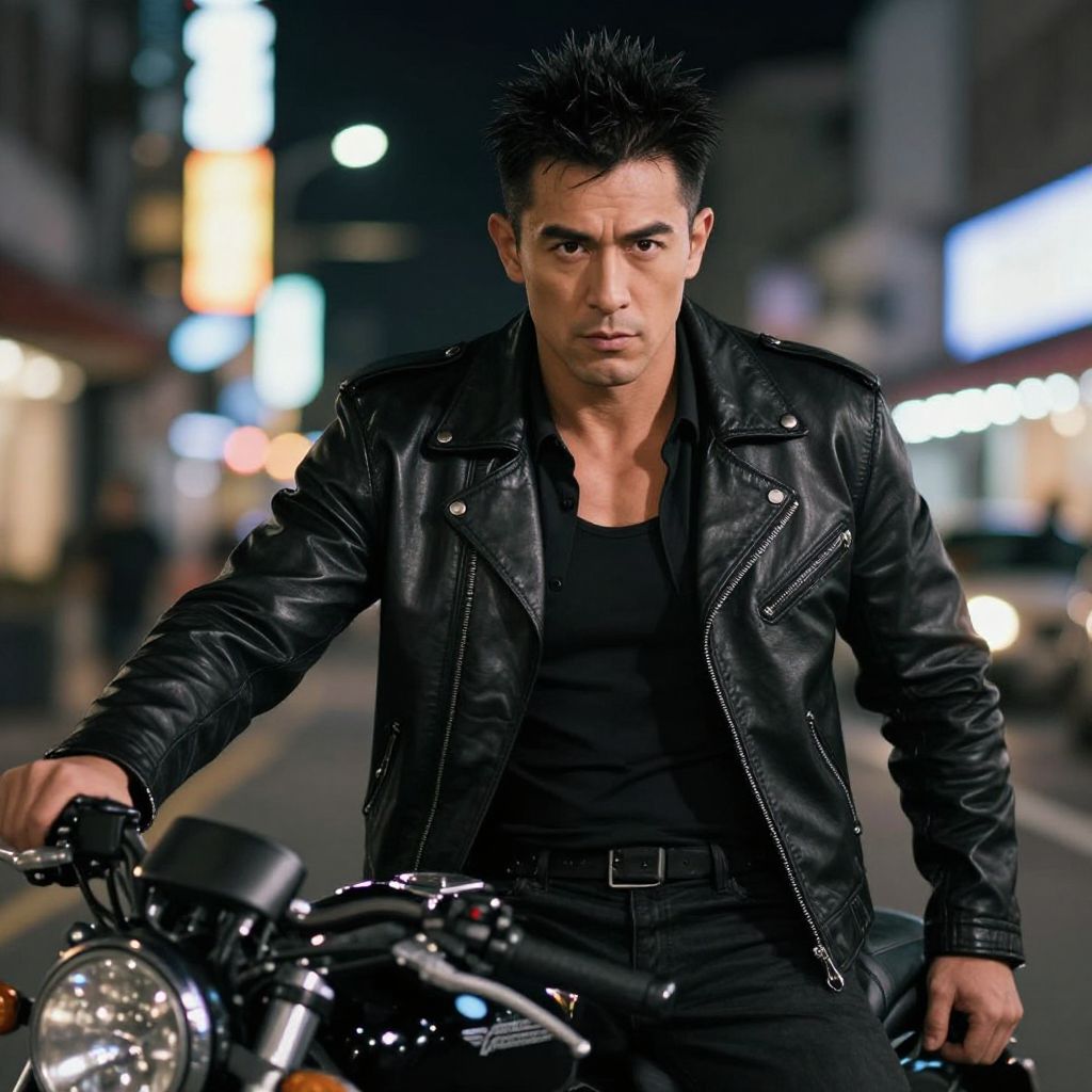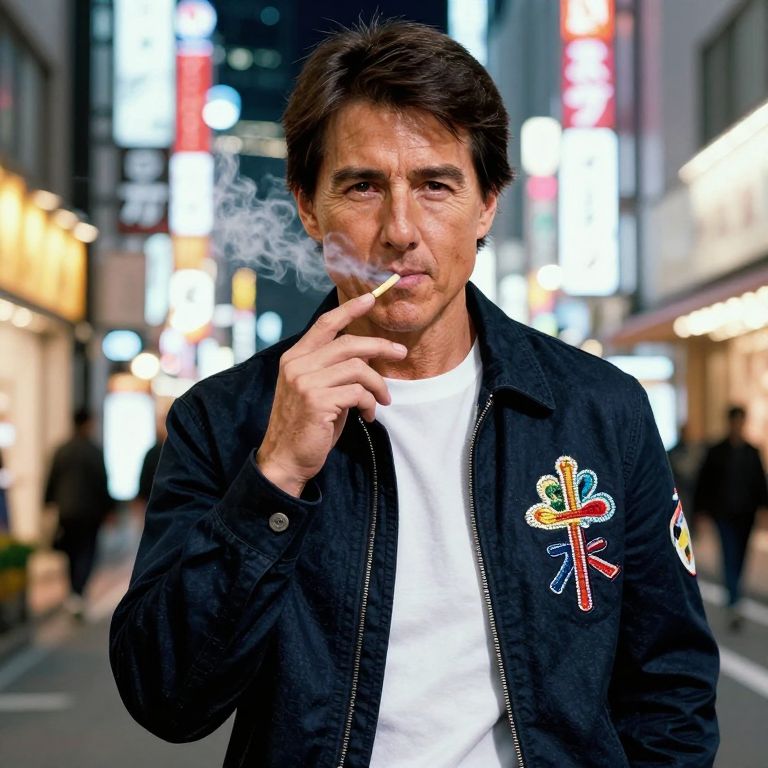 Embroidery Embellishment Tom Cruise acts Chinese person stands on a Tokyo neon-lit street, smoking and looking at the camera. Super detail. photo realistic,
