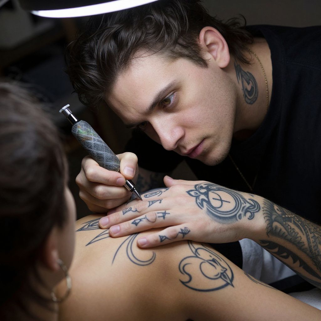 Envision an iPhone portrait of a mysterious tattoo artist in their dimly lit studio, their intense gaze mirroring the concentration required for their craft as they trace intricate designs onto a seated model's skin with nimble hands. This close-up, shot from above to emphasize admiration and curiosity, captures the delicate interplay between artist and subject: the former's focused expression and deft movements, the latter's serene yet captivated face. Soft lighting accentuates every line and curve of their tattoos and features, evoking an emotional spectrum that speaks to the passion, creativity, and personal connection inherent in body art.