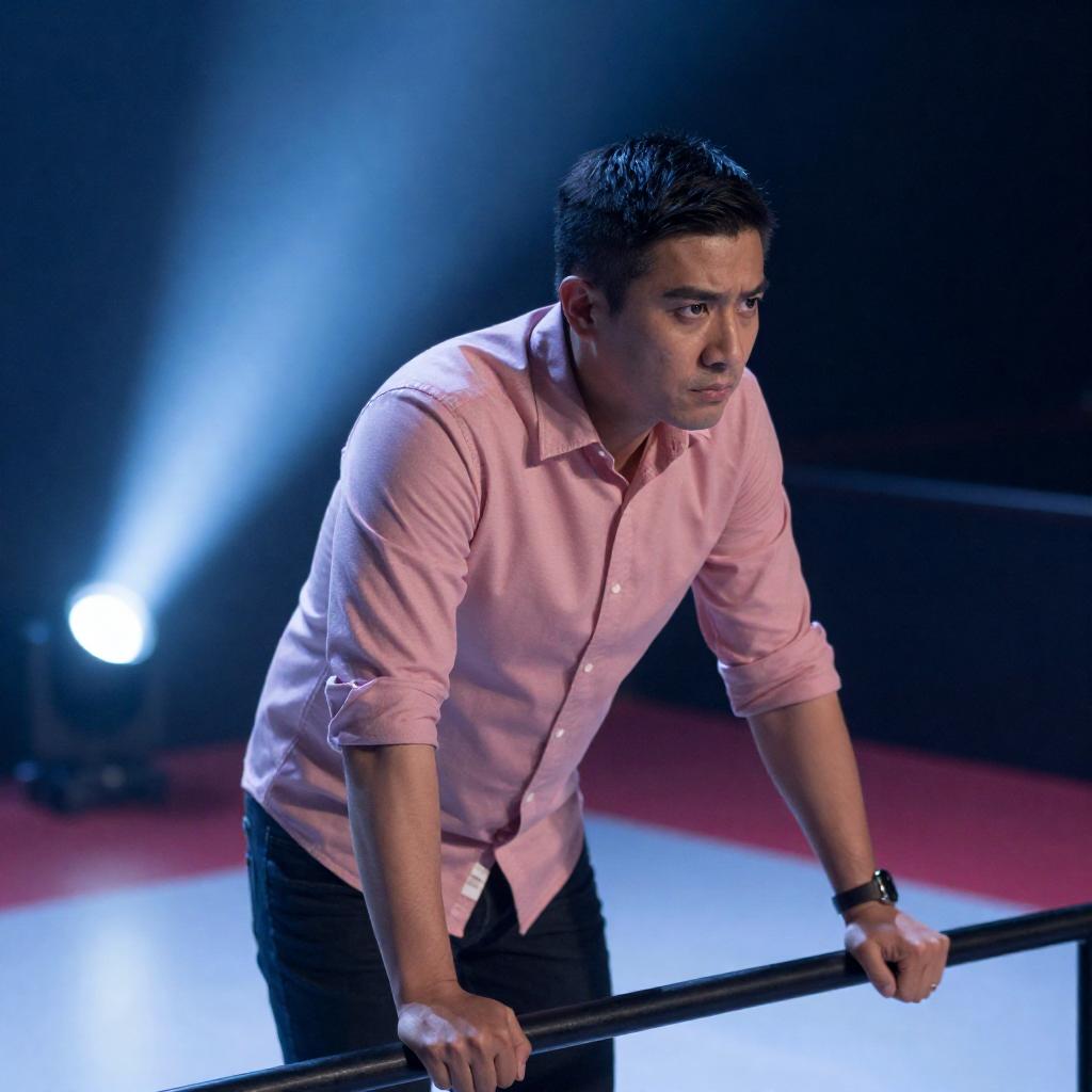 Photograph of a serious-looking man with short dark hair, wearing a pink button-up shirt and dark pants, leaning forward with his right hand on a black railing. He is in a dimly lit, blue-hued room with a spotlight on the left, and a red and white floor in the background. The man's focused expression and posture suggest determination.