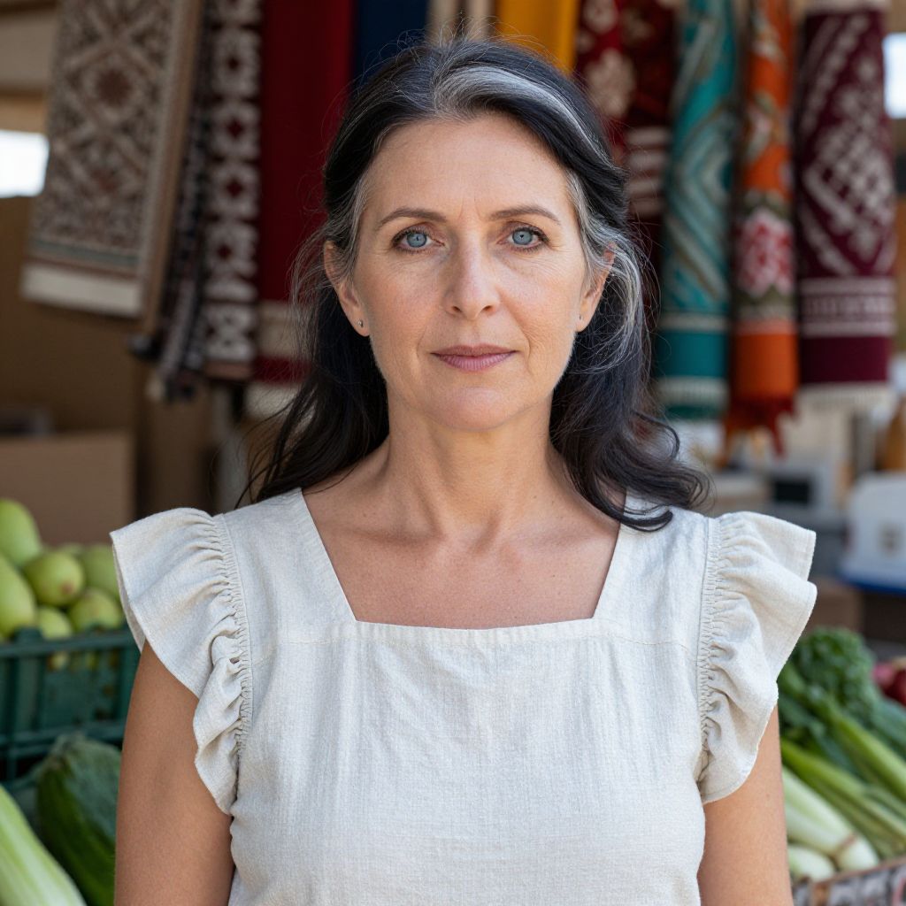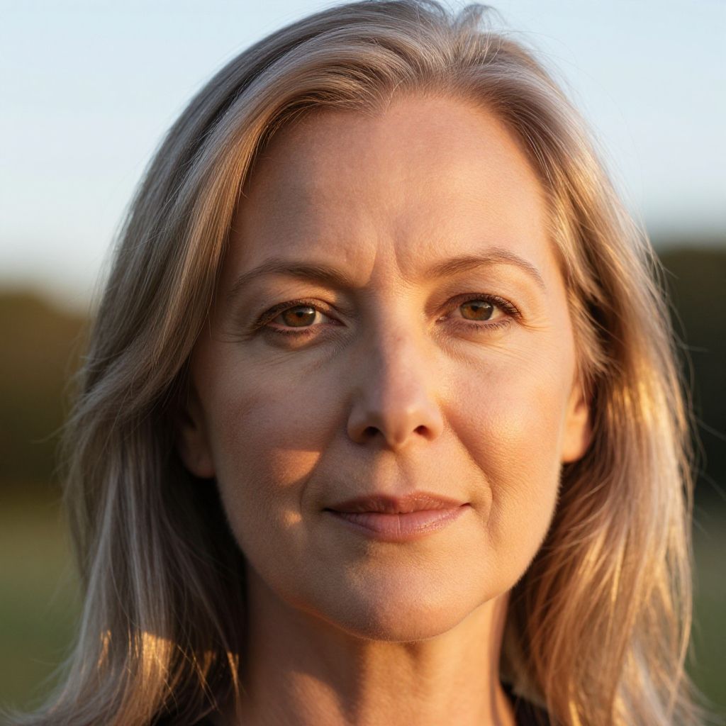 50 year old woman face, confident expression, silver-streaked hair, clear skin texture, outdoor setting with golden hour light, photorealistic detail