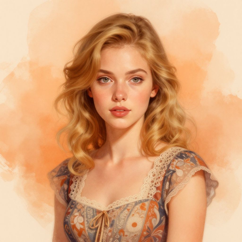Photograph of a blonde woman with blue eyes, wearing a white ruffled blouse and blue jeans, holding a glass of rosé in a warmly lit