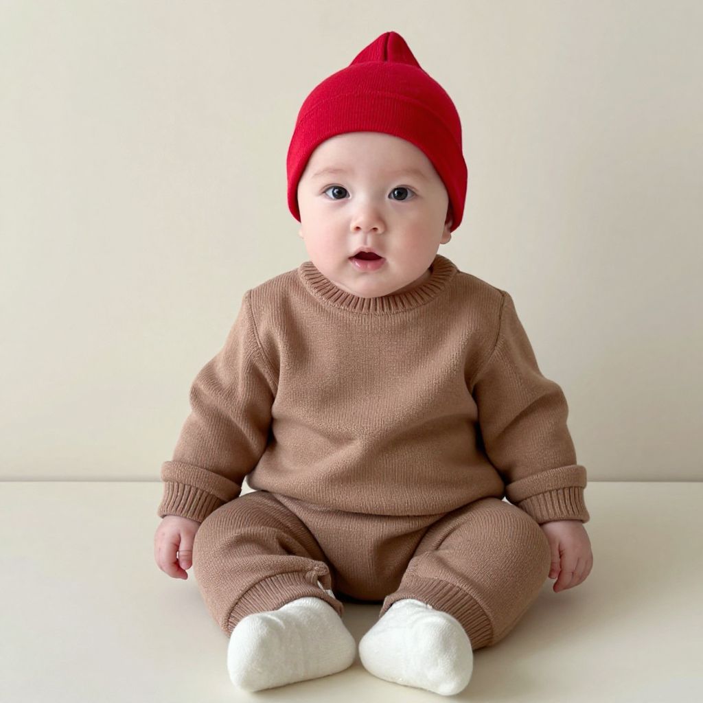 Photograph of a fair-skinned, wide-eyed baby with round cheeks, sitting against a plain white background. The baby wears a bright red knit beanie, a brown knit sweater, and matching brown pants, paired with white socks. The baby's mouth is slightly open, and they are looking directly at the camera. The texture of the knit clothing is visible, showing a soft, slightly fuzzy fabric. The baby is seated with legs slightly apart and hands resting on the ground. The overall scene is bright and minimalistic, focusing attention on the baby's colorful beanie and warm clothing.
