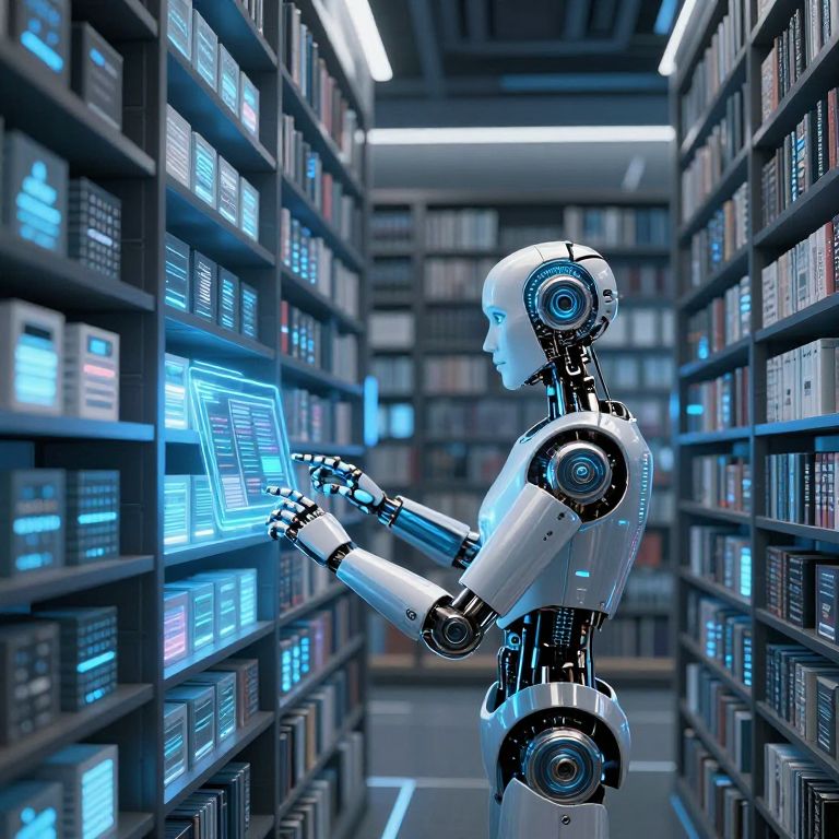Cybernetic robot with white and blue metallic body, accessing digital screens on illuminated, towering server shelves in futuristic library.