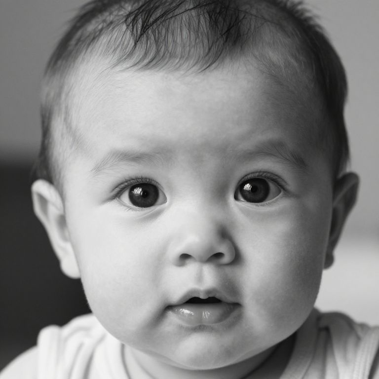 Captivating black-and-white portrait of a baby with wide, expressive eyes, showcasing stunningly realistic details in its delicate facial features and soft, textured hair.