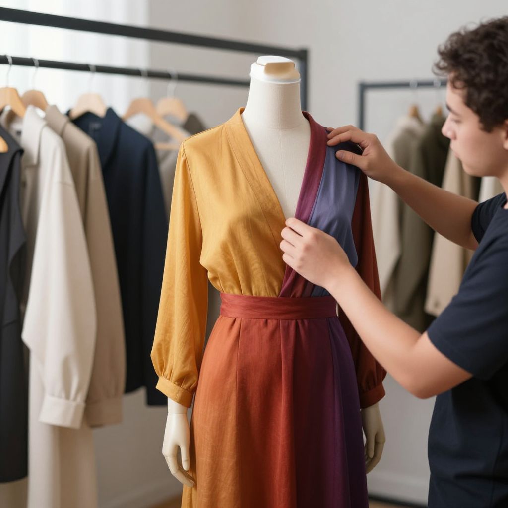 Photograph of a fashion showroom. A young man with curly brown hair, wearing a black t-shirt, adjusts the neckline of a dress on a headless mannequin. The dress has a gradient color scheme, transitioning from mustard yellow in the sleeves to deep maroon at the hem, with a matching maroon belt. In the background, various coats and jackets are displayed on hangers against a white wall, illuminated by bright overhead lights. The mannequin is centered in the image, and the young man is positioned to the right.