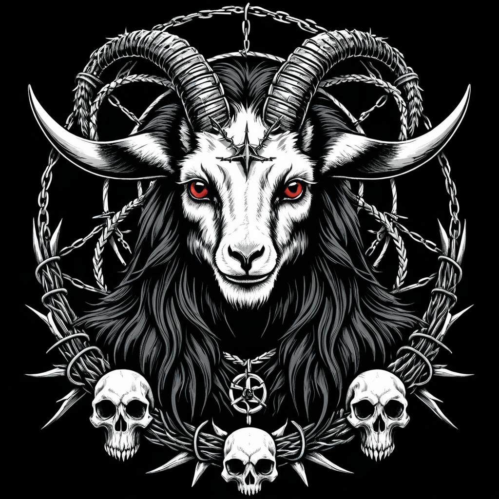 Overhead t-shirt design featuring a mythical beast with snake eyes and long hair. Styled in dark fantasy, featuring goat skulls, thorny elements, and barbed wire with black-and-white vector illustration on a black background.