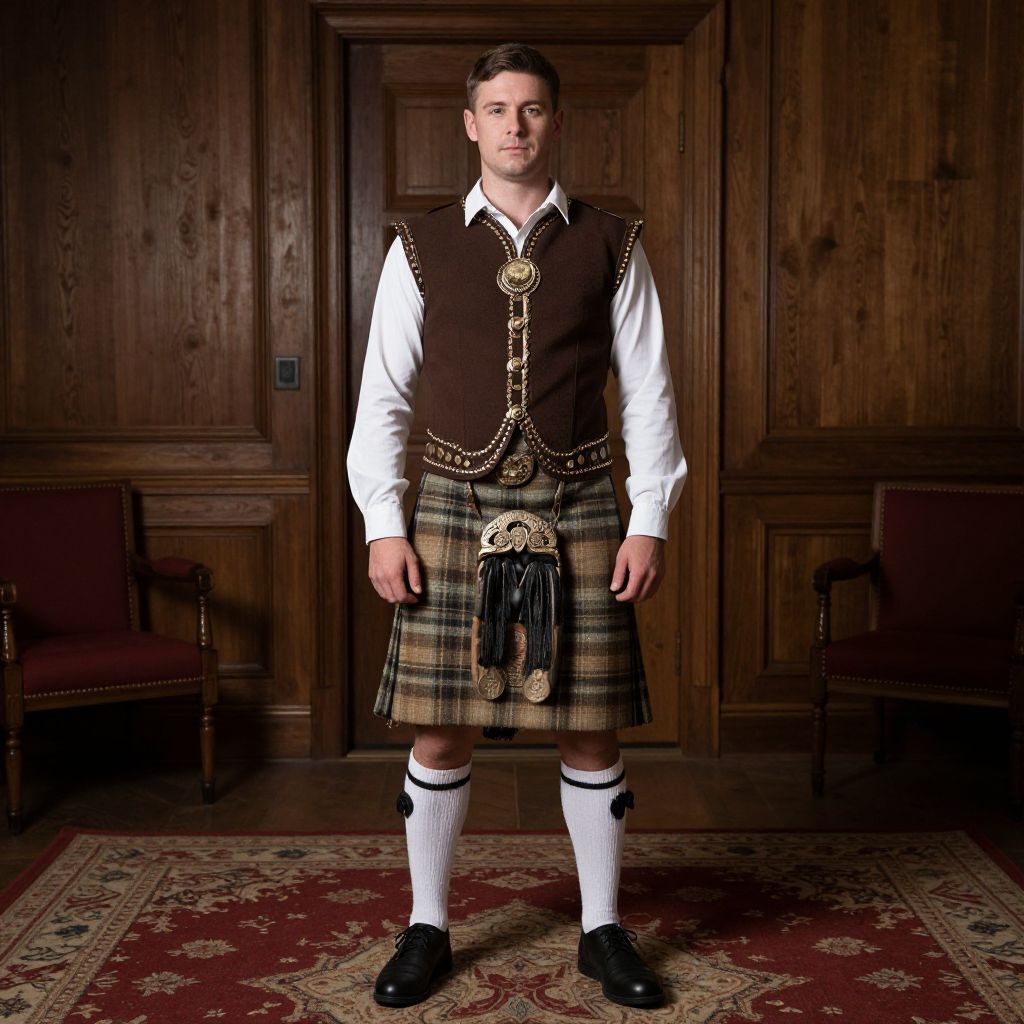 Gaelic Costume, man in a brown and white outfit standing in a room