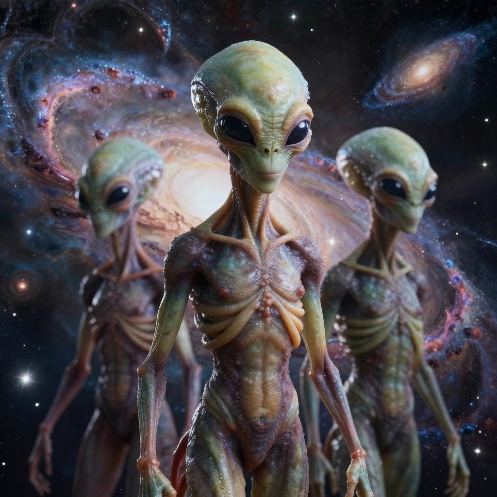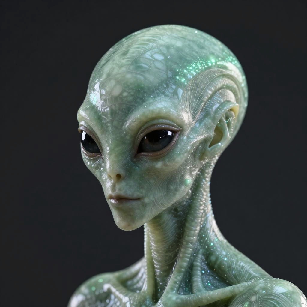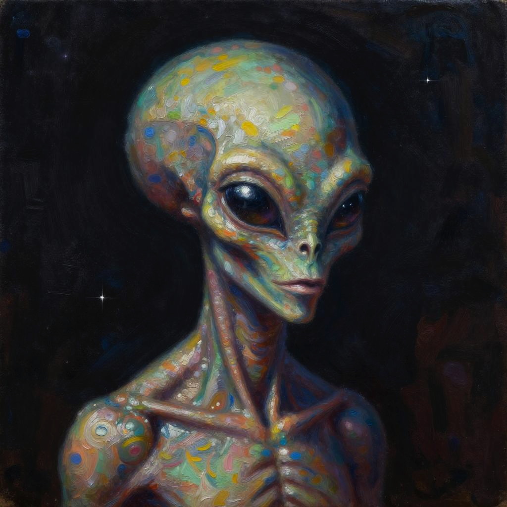 Alien oil painting of a futuristic alien portrait with exaggerated features, detailed brushwork, glowing elements, set against an abstract cosmic backdrop, high contrast and ethereal aura