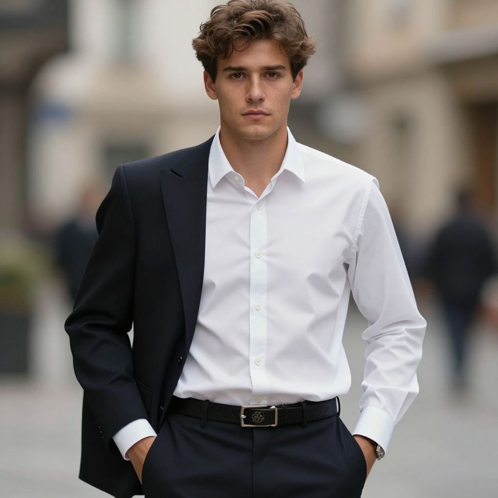 Photograph of a young Caucasian man with wavy brown hair and a serious expression, standing in an urban street. He wears a crisp white dress shirt, a black tailored suit jacket, and black trousers with a black belt. His hands are in his pockets. The background is slightly blurred, featuring indistinct buildings and people, suggesting a city setting. The contrast between his white shirt and black suit emphasizes a formal, stylish look. The overall atmosphere is modern and professional.