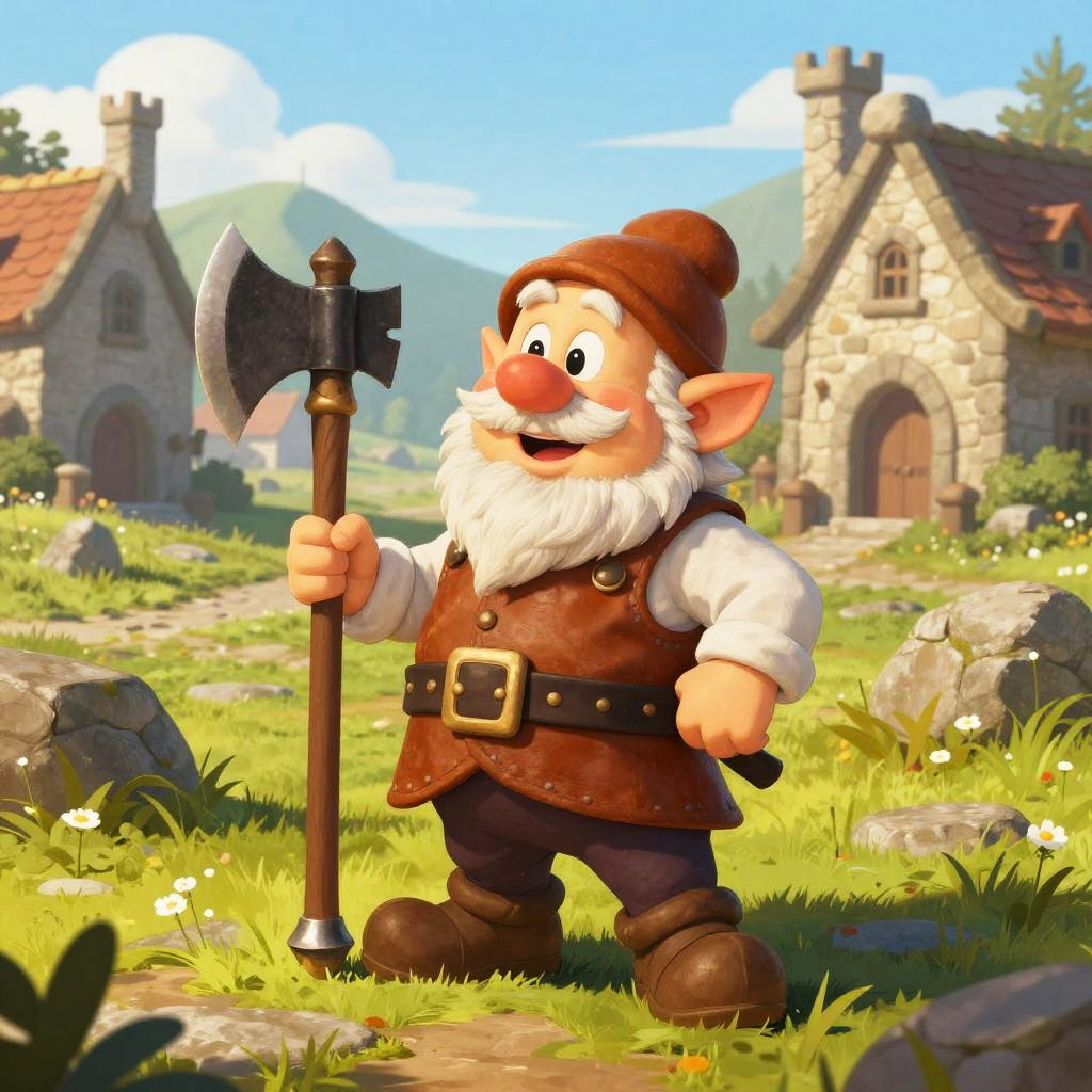 Young dwarf standing proudly in a medieval fantasy village, wearing leather armor and holding a battle axe, detailed stone cottages in the background, vibrant colors, fantasy art style