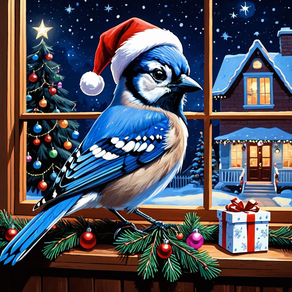 Cute Pixar-style painting, an adorable bluejay, fat, angry, Christmas theme, at midnight, ornaments, window of a house, town view, Christmas tree, gifts, Santa hat, Christmas lights, nebula in the background