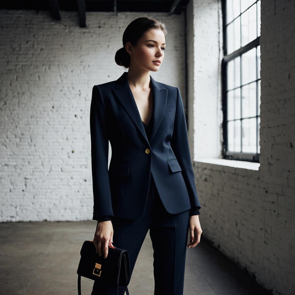 Chignon hairstyle on woman, wearing sleek pantsuit, in fashion studio, captured in fashion editorial style with warm soft light.