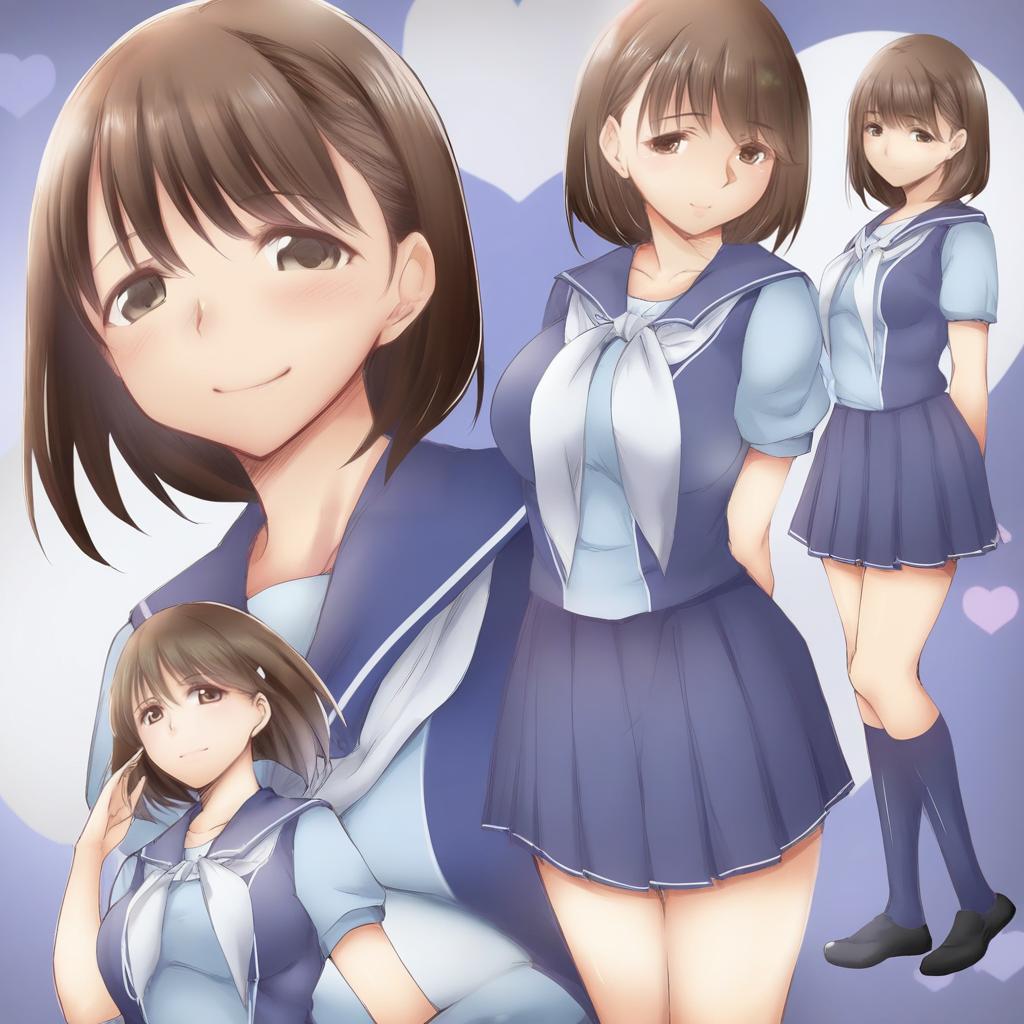 Illustration of a young anime girl with short brown hair and brown eyes, featuring a mole under her eye. She wears a traditional Japanese navy blue and light blue sailor school uniform with a pleated skirt and knee-high socks. The character is depicted in multiple poses against a soft background with heart shapes.
