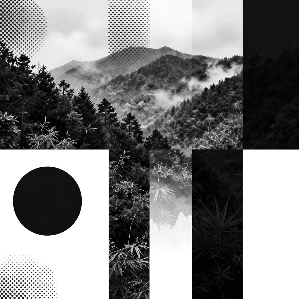 This is a black and white digital artwork featuring a collage of mountain and forest scenes. The image is divided into vertical panels with varying textures: some have dotted patterns, others are solid black or white, and there are circular shapes on the left. The mountain landscape shows dense trees and misty valleys, creating a moody, abstract composition.