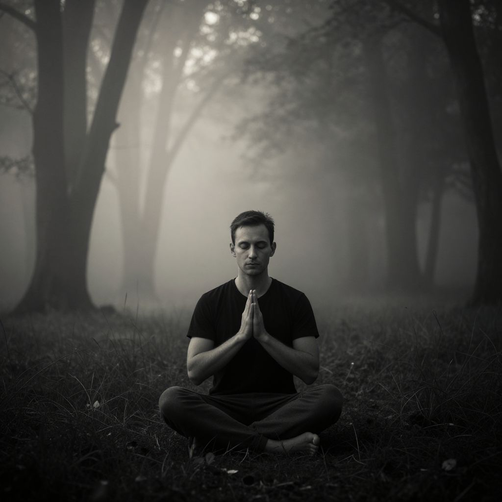 Serene forest glade, misty morning light filtering through trees, soft focus, monochromatic palette, deep shadows, subtle highlights, ethereal mood, contemplative figure seated cross-legged on grassy clearing, eyes closed, hands clasped together, serene expression, Zen meditation in action, dramatic bleach bypass style, high contrast, desaturated Man has masculine face and piercing eyes