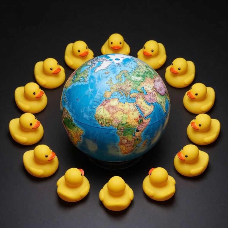 Globe showcasing Earth's continents is encircled by twelve vibrant yellow rubber ducks, evenly spaced along its equatorial plane, creating a whimsical and symmetrical display against a dark background.