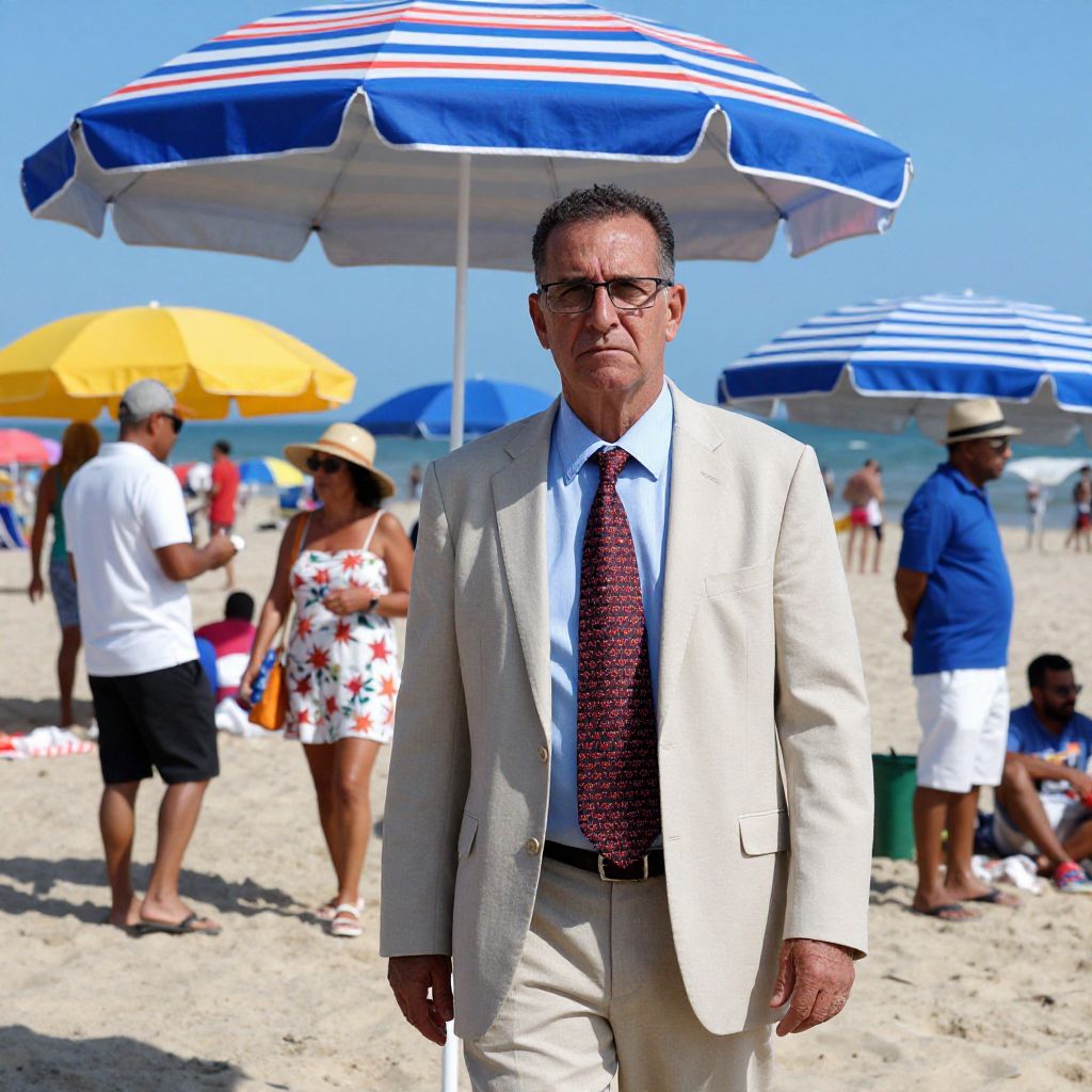 Photograph of a middle-aged man with short dark hair and glasses, standing on a sunny beach. He is wearing a light beige suit, white shirt, and maroon patterned tie. Behind him, there are large blue-and-white striped beach umbrellas, a yellow umbrella, and several people in summer attire. The sandy beach is bustling with activity; people are walking, sitting, and chatting. The clear blue sky and bright sunlight enhance the vibrant, relaxed beach atmosphere. The man's serious expression contrasts with the casual, cheerful scene around him.