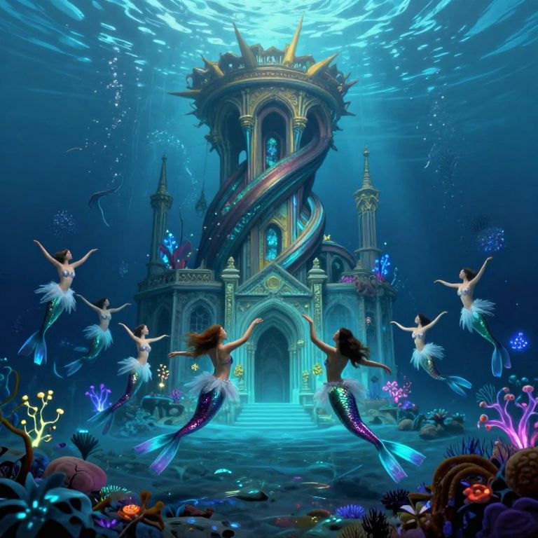Imagine a mesmerizing digital illustration reminiscent of Salvador Dalí's surrealistic vision. This enchanting scene portrays an underwater ballet where graceful mermaids gracefully dance around a sunken, twisted architectural structure resembling the iconic Melk Abbey. The mysterious aquatic performance is illuminated by shimmering bioluminescent flora and fauna, casting an iridescent glow that highlights both the surreal architecture and the flowing movements of the mermaids. This captivating image should evoke a sense of wonder and enchantment, blending elements of fantasy with Dalí's signature surrealist style to create a mesmerizing and thought-provoking visual narrative.