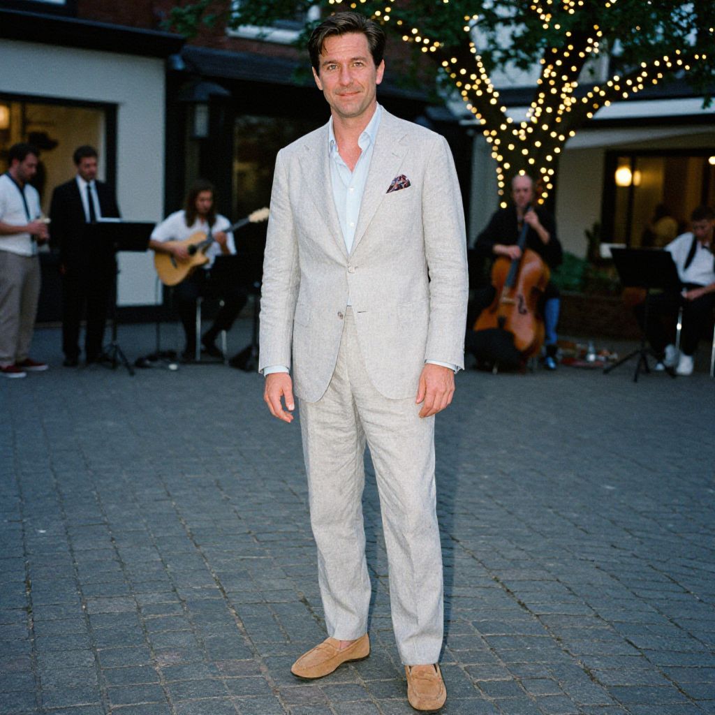 A man, light gray linen suit, pale blue dress shirt, patterned silk pocket square, tan suede loafers, slim-fit tailored cut, charming cobblestone square, local musicians, twinkling lights, Ilford film stock, relaxed smile, confident demeanor. Man has masculine face and piercing eyes