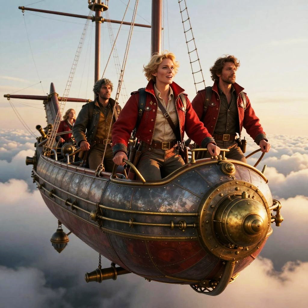 Red jacket characters aboard a steampunk airship flying above clouds, vintage machinery and brass details, adventurous expressions, sunset lighting casting warm hues on metal and fabric, dynamic composition capturing movement and exploration spirit.