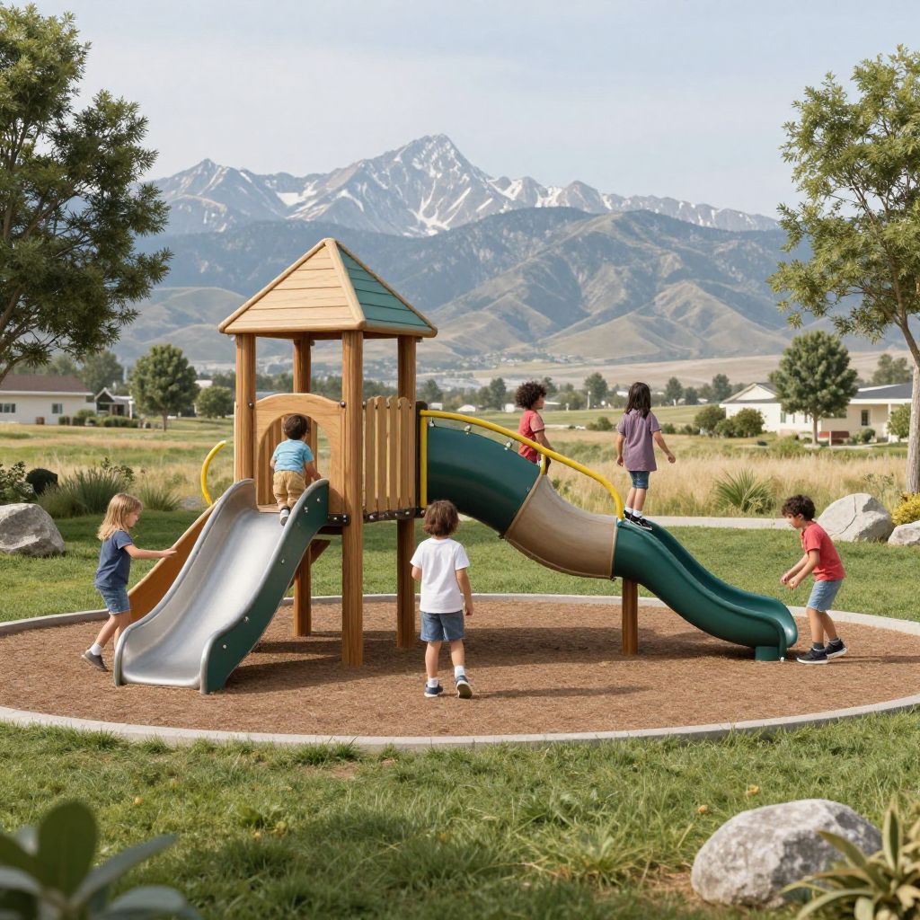Photograph of a colorful playground set in a grassy park with a mountainous backdrop. Six children, diverse in age and gender, play on the wooden structure with green slides, a silver slide, and a yellow ladder. One child climbs the ladder, another slides down the silver slide, while the others play on the green slides. The playground is surrounded by a brown rubberized surface. Trees and suburban houses are visible in the background, with snow-capped mountains under a clear blue sky. The children wear casual clothes in various bright colors.