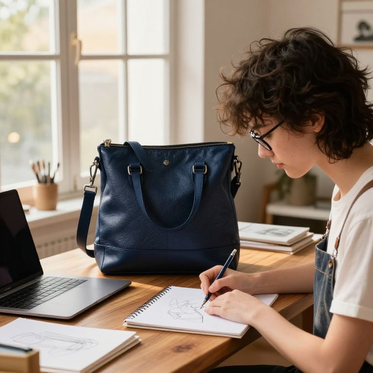 A young digital artist in her 20s with messy dark hair and glasses, working on a drawing pad in a cozy, well-lit home studio, the straps of her navy blue strapped bag gently resting on a wooden desk with a laptop and sketchbooks nearby, the bag displaying a subtle pattern and a soft leather texture, illuminated by golden hour light from a large window.