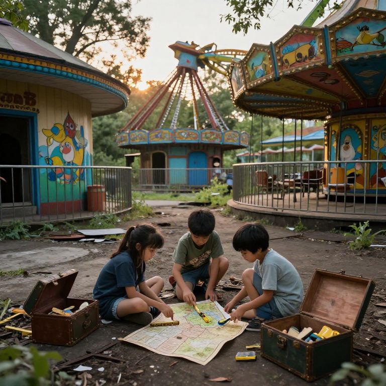 Prompts kids exploring an abandoned amusement park at dawn, filled with forgotten rides and colorful murals, discovering hidden treasure maps and old toy boxes, soft light filtering through trees, imaginative adventure vibe, cinematic perspective, detailed environment, 4K hyperrealist