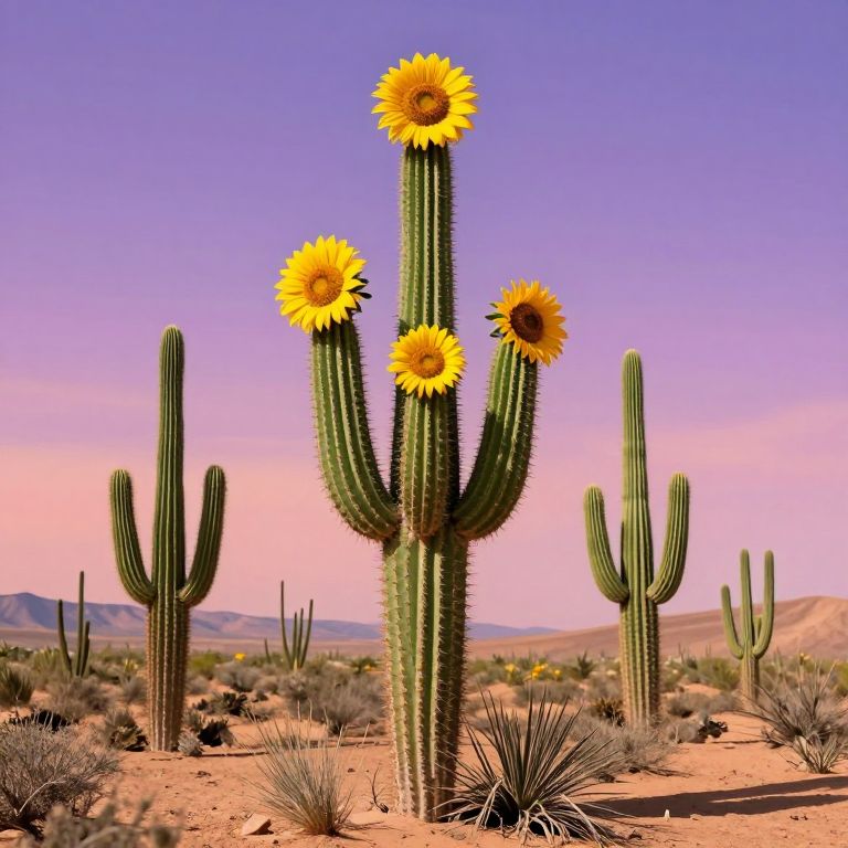 In a surreal desert landscape, cacti sprout sunflowers instead of spines, defying botanical norms as they stand tall against a vividly painted sky.