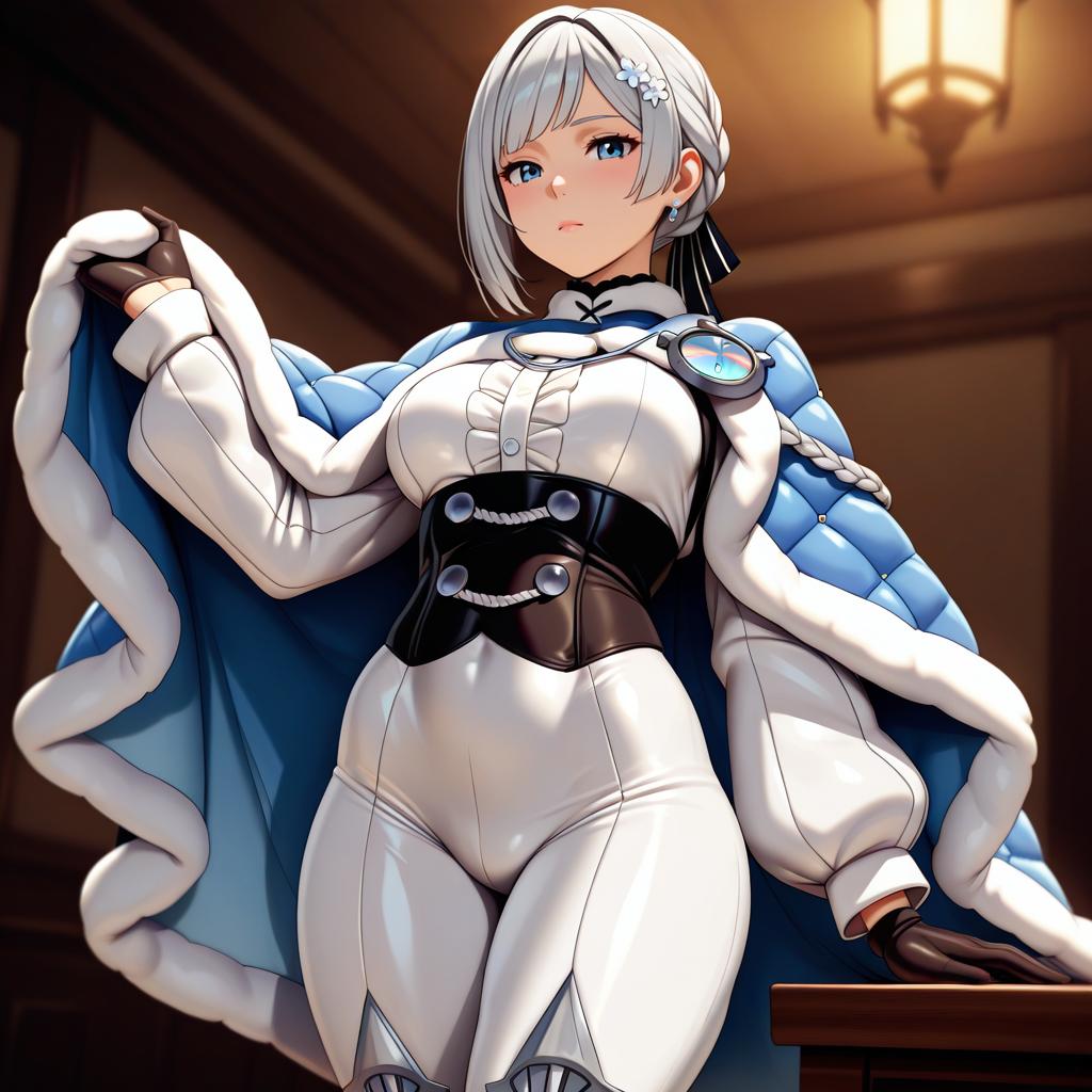 Digital illustration of a confident young woman with grey hair styled in a braid and adorned with a floral hair ornament. She has striking blue eyes and wears a white tight bodysuit with a frilled shirt underneath. Her outfit includes a black corset, fur-trimmed blue padded cape, and black gloves. The setting is indoors with warm lighting, and the character exudes a strong and poised presence.
