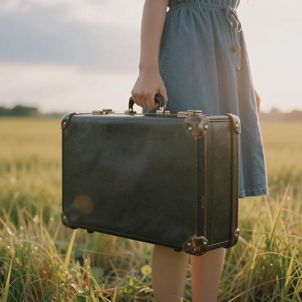 From side, close-up, The girl carried a very old black suitcase in her single hand, realistic, (Yellow and green grass), cloud, lens_flare, Natural light, Grey Film filter, (KODAK Ektar 100:1.2), portrait