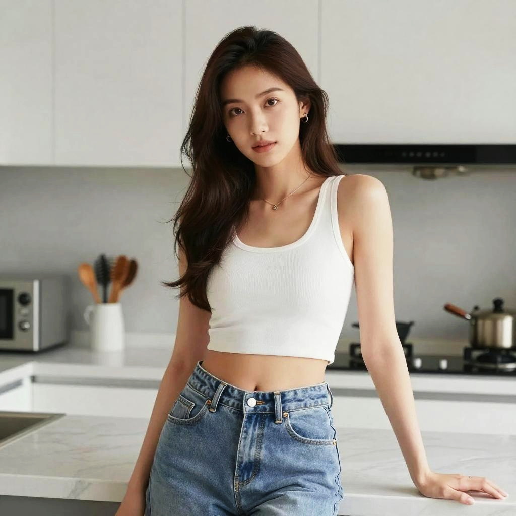 A woman with long dark hair lounges casually on a leather armchair in a cozy, sunlit attic room. She wears a white crop top and light-colored sweatpants, blending casual lifestyle and natural lighting for a relaxed, intimate portrait.