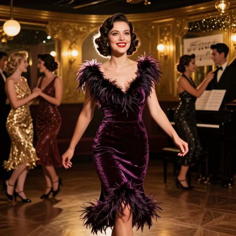 A vivacious 1930s nightclub hostess with warm brown eyes, a wide smile, and a flawless oval face, wearing a feathered velvet evening gown that flares at the hem, gliding across a moody dance floor under soft overhead lighting with a spotlight shining on her face and feathered jacket, surrounded by flappers and jazz-age dancers in a golden-hued nightclub with speckled mirrors and jazz piano notes echoing.