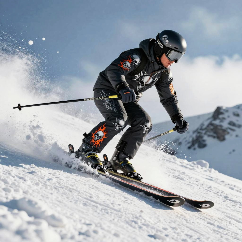 Close-up action shot of an iron maiden ski carving sharp turns on a steep ski slope, snow spray flying, heavy metal inspired graphic design on skis with skulls and flames, powerful dynamic composition, dramatic winter sky background, ultra detailed realism.