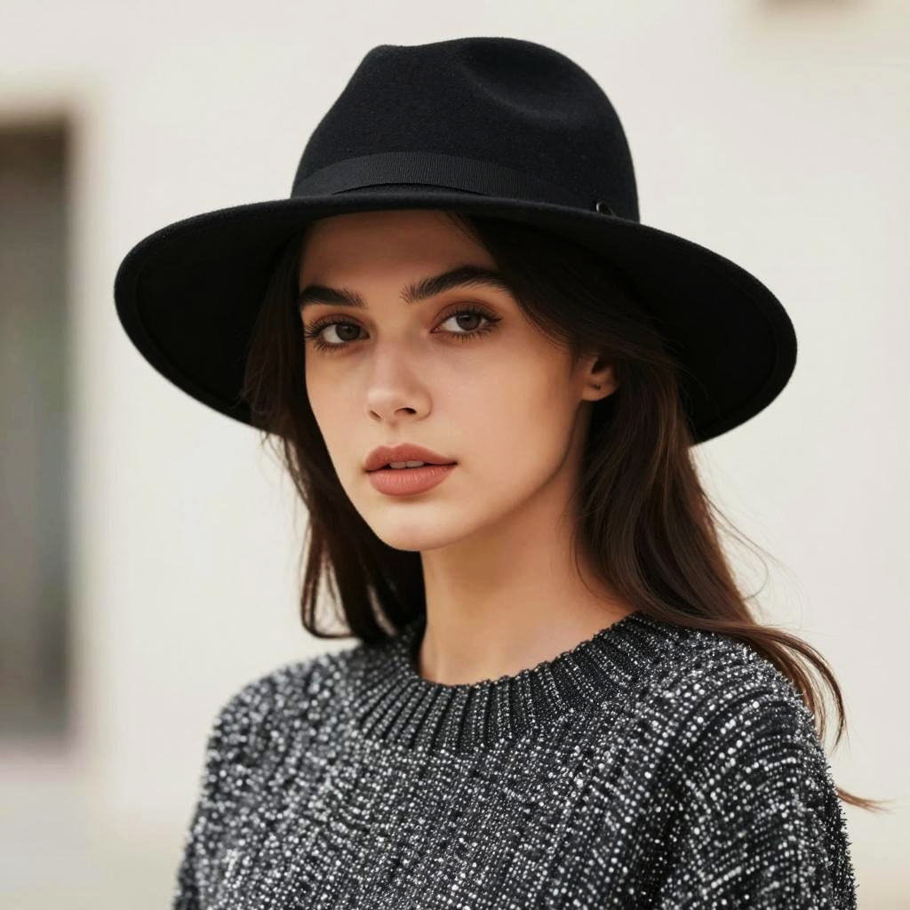 Portrait of a young woman wearing a stylish black wide-brimmed hat and a textured knit sweater. She has fair skin, long dark hair, and natural makeup, captured against a soft focus neutral background highlighting her elegant and modern fashion style.