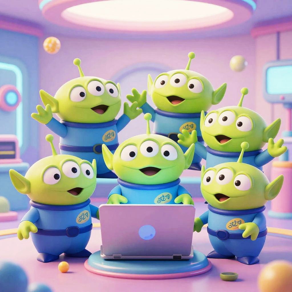 3D Pixar-style illustration of a miniature friendly alien with antennae, with large, innocent-looking eyes and a round chubby face. The scene is dreamy, with tinkling chimes and a carefree, imaginative aesthetic in 8K ultra-high quality.
