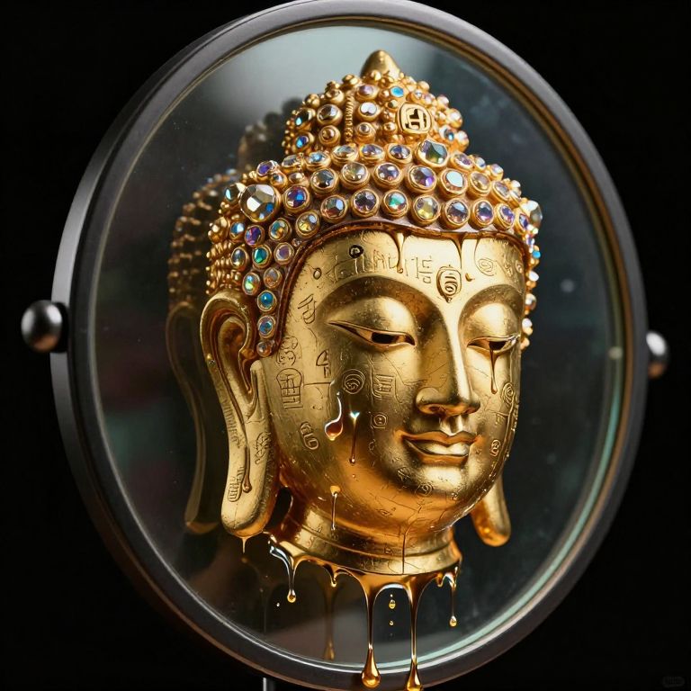 The image presents a highly detailed, golden 3D Buddha face emerging from a mirror, set against a black background. The face is intricately designed with ancient symbols and iridescent crystals, giving it a cyberpunk aesthetic. The Buddha's face is melting, with golden droplets cascading down, creating a sense of fluidity and transformation. The mirror frame is black, contrasting sharply with the golden face, and the overall composition is reflective, with the Buddha's face appearing to emerge from the mirror's surface. The image is hyper-realistic, with a sense of depth and realism that makes the melting effect appear almost tangible. The interplay of colors, textures, and shapes creates a visually striking and dynamic scene, with the golden Buddha face as the central focus.
