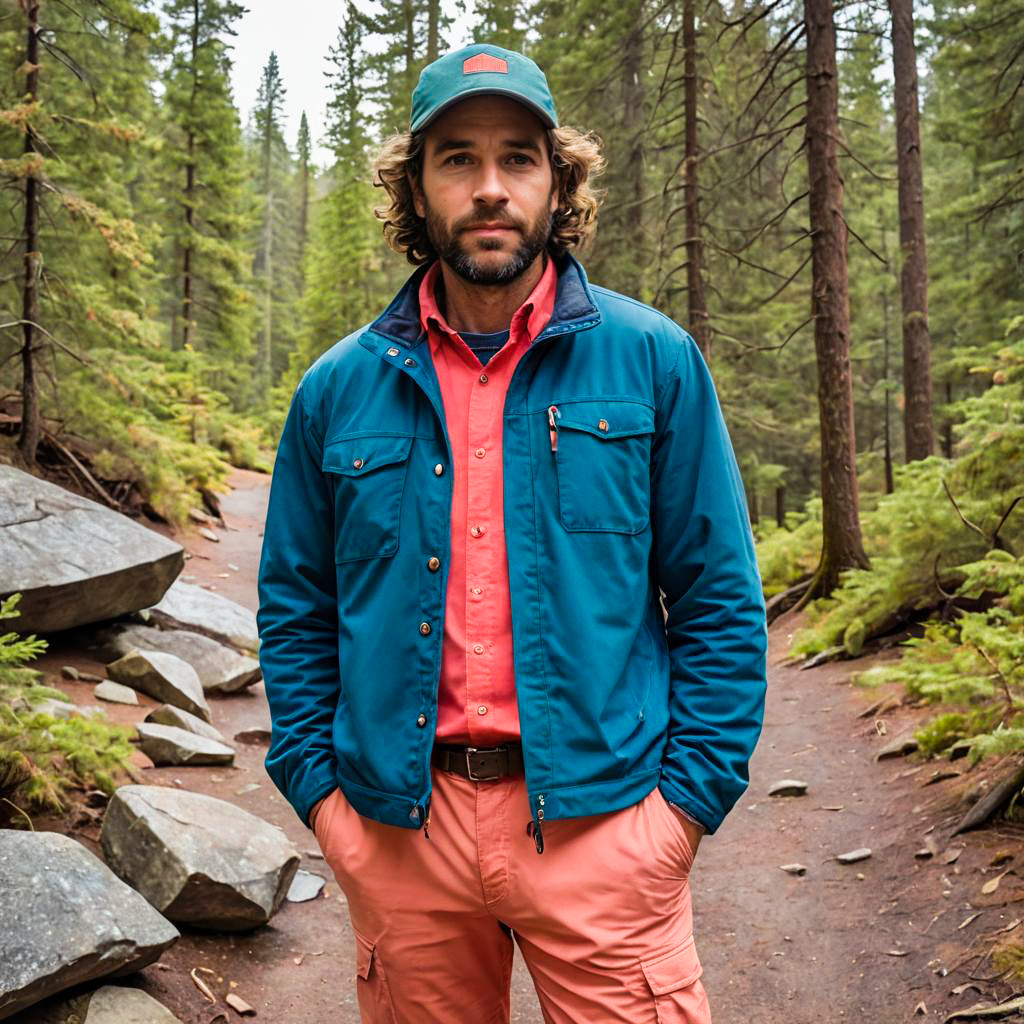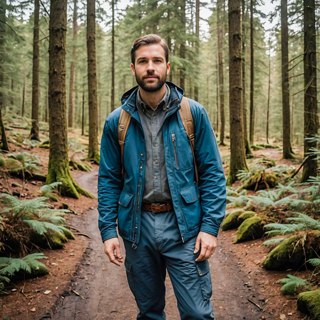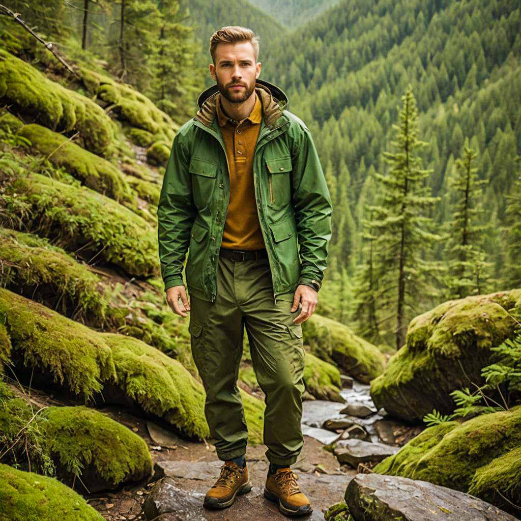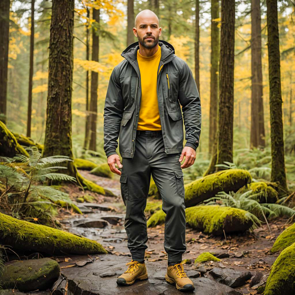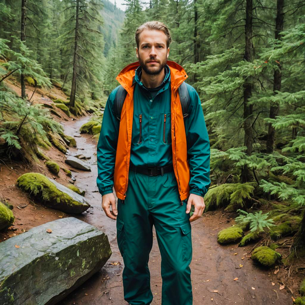 A lean man standing on a mountain trail surrounded by dense green forest. He is wearing forest green nylon cargo pants, a slate blue synthetic moisture-wicking shirt, and a burnt orange softshell fleece jacket. The man has cornrows and carries a backpack, dressed appropriately for hiking in cool weather.