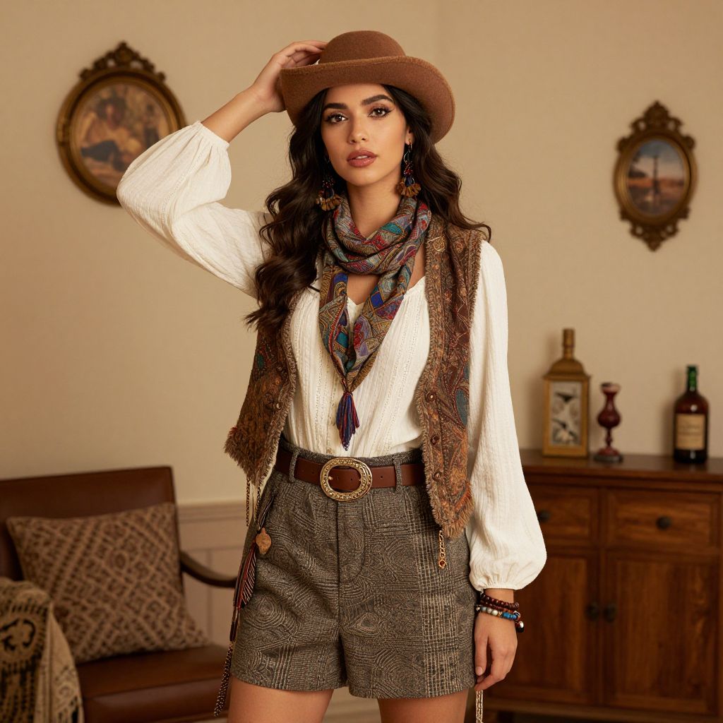 Photograph of a young woman with long, wavy dark hair and olive skin, standing in a warmly lit, vintage-style room. She wears a brown cowboy hat, white long-sleeved blouse, and patterned brown vest over high-waisted, checkered shorts secured with a brown belt featuring a circular buckle. A multicolored scarf is loosely wrapped around her neck. The background includes a brown leather sofa with patterned cushions, wooden side table with bottles, and framed paintings on the cream-colored wall. The woman's expression is neutral, and she gazes directly at the camera. Her right hand rests on the hat's brim.
