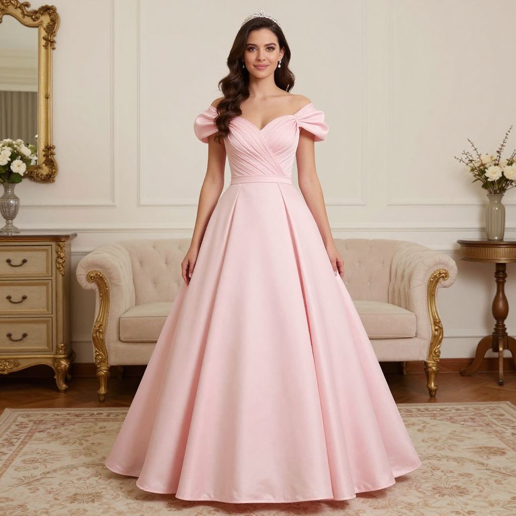 Photograph of a dark-haired woman with fair skin standing in an elegant room. She wears an off-the-shoulder, pink satin ball gown with puffed short sleeves and a deep V-neckline. The gown has a fitted bodice and a full, flowing skirt. She also wears a small tiara. The background includes a beige tufted sofa with gold accents, a wooden dresser with brass handles, and a gold-framed mirror. A vase with white flowers sits on the dresser. The floor has a patterned rug, and the walls are white with decorative moldings. The overall setting exudes a classic, luxurious ambiance.