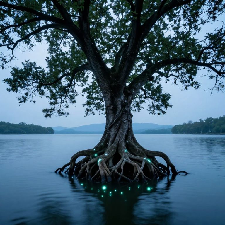 Visualize an expansive dreamlike vista where a colossal tree with gnarled, twisting roots stretches towards the clear azure sky. The tree's branches form a canopy over a serene lake, casting intricate patterns of dappled light onto its tranquil waters. From a bird's eye view, witness this mesmerizing aerial scene: ethereal floating islands drift languidly through the air, suspended by delicate strands of cosmic threads that shimmer with iridescent hues. As the sun sets behind the towering tree, a symphony of golden and violet hues bathes the fantastical landscape, evoking feelings of wonder, tranquility, and awe in equal measure.