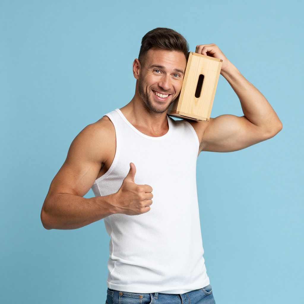 Photograph of a muscular, smiling man with short brown hair. He's wearing a white tank top and blue jeans, giving a thumbs-up with his right hand while lifting a wooden box on his left shoulder. The background is a solid light blue. His expression is friendly and confident, showcasing his strong, defined arms. The overall vibe is fun and energetic.