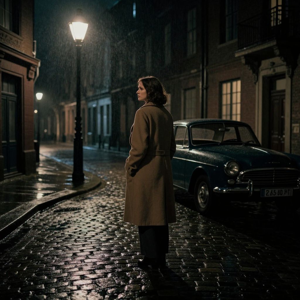 In this noir-inspired scene, a woman in a long coat stands on a cobblestone street, her back to the viewer, as she gazes around her. The rain-soaked street reflects the soft glow of a streetlamp, casting a moody atmosphere. The buildings lining the street are dark and imposing, their windows illuminated by the streetlamp's light. A vintage car is parked on the side of the street, its sleek lines adding to the cinematic feel of the scene. The woman's posture suggests she is lost in thought, perhaps contemplating the mysteries of the night. The overall composition is balanced, with the woman positioned centrally, the streetlamp to her left, and the car to her right, creating a sense of depth and perspective. The interplay of light and shadow, combined with the dark, wet cobblestones, enhances the noir aesthetic, evoking a sense of intrigue and suspense.
