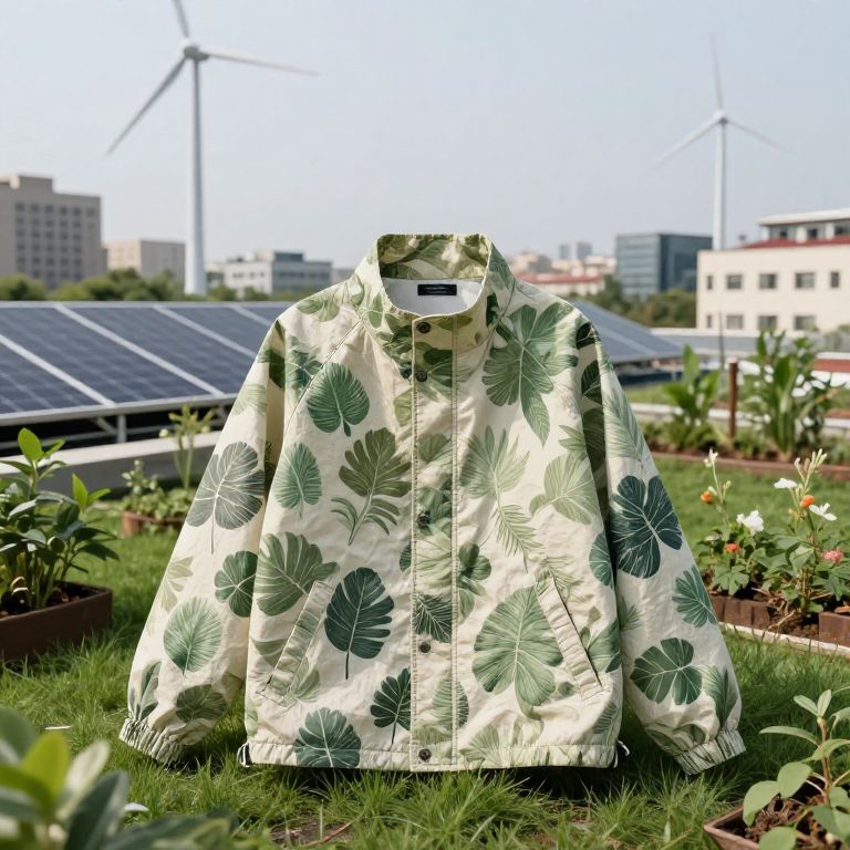 A sustainable jacket prompt of a biodegradable, plant-based fabric jacket with a leaf pattern, placed on a green rooftop garden with solar panels and wind turbines in a quiet eco-friendly cityscape.