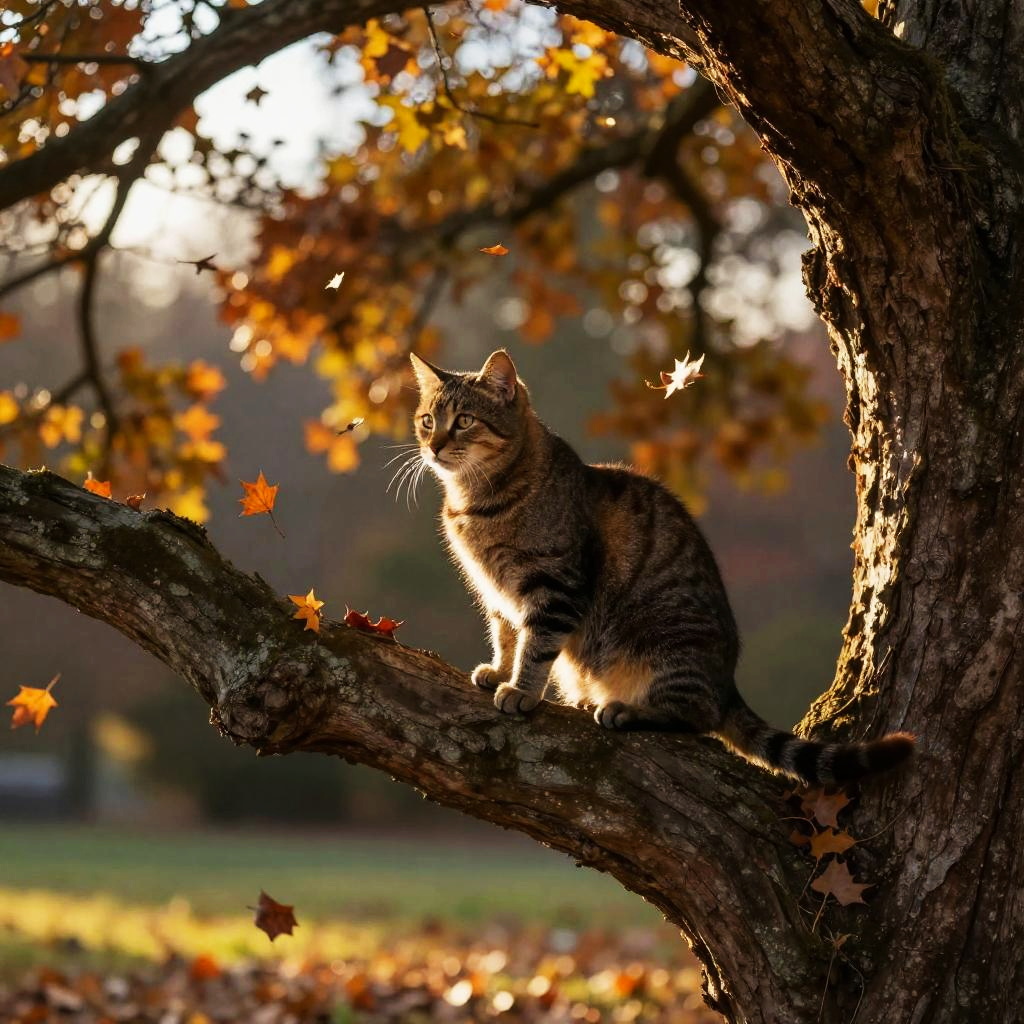 Photo of a Cat poised gracefully atop an ancient oak tree, autumn leaves fluttering around, golden hour casting long shadows, backlit, sharp focus on feline, bokeh effect on background foliage, cinematic film still.